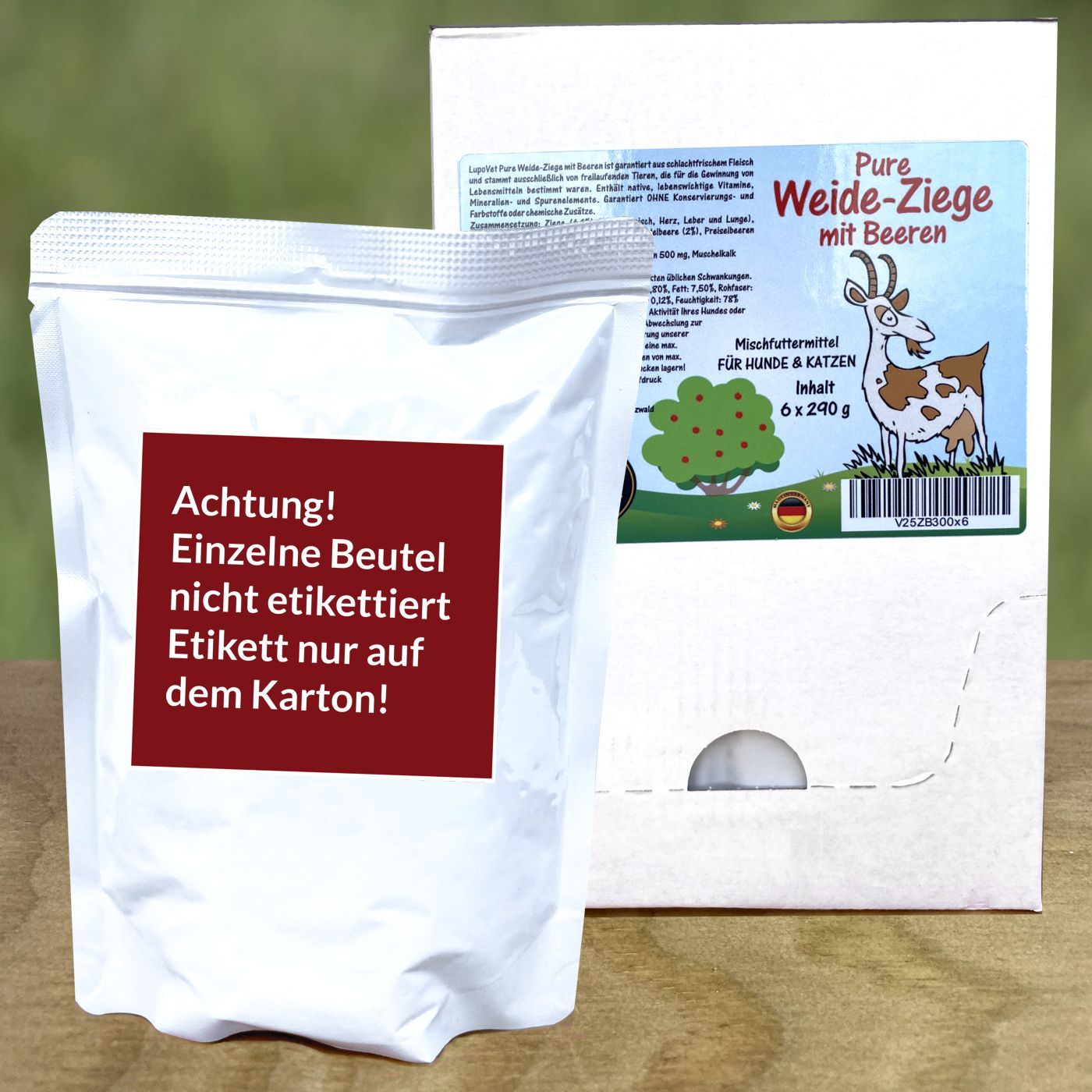 LupoVet Pure Weide-Ziege mit Beeren ist als Mischfuttermittel für Hunde und Katzen garantiert aus schlachtfrischem Fleisch mit optimiertem Calcium-Phosphorverhältnis und stammt ausschließlich von freilaufenden Tieren, die für die Gewinnung von Lebensmitteln bestimmt waren.